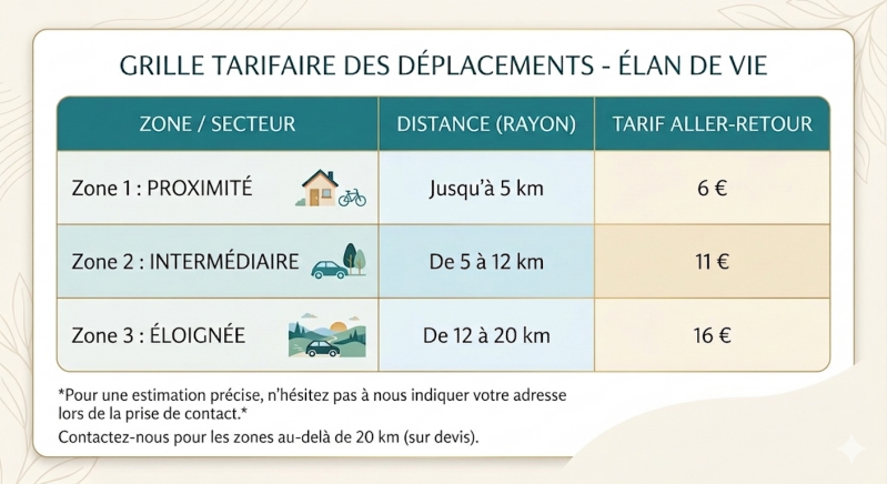 Tarification déplacements AR interventions ( hors deplacements courses ou accompagnement)